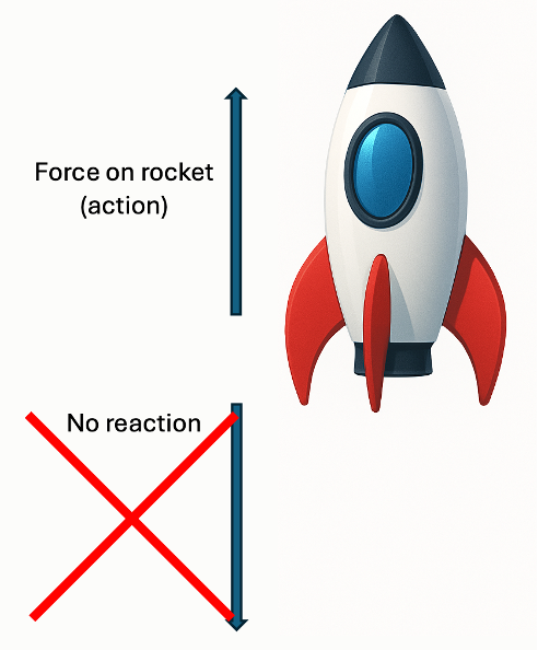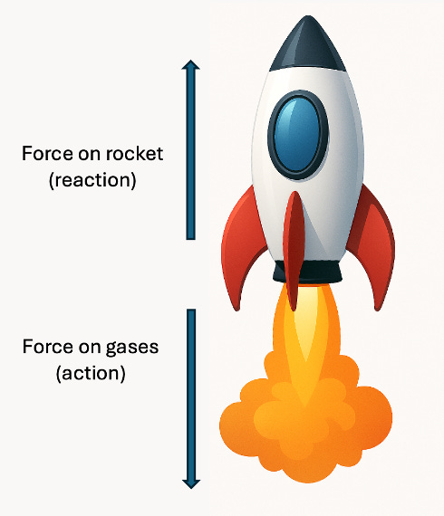 The basic physics of rocket-based propulsion: vast quantities of fuel are ignited, and the resulting hot gas is pushed through a nozzle (action), resulting in an equal and opposite force (reaction) on the rocket.