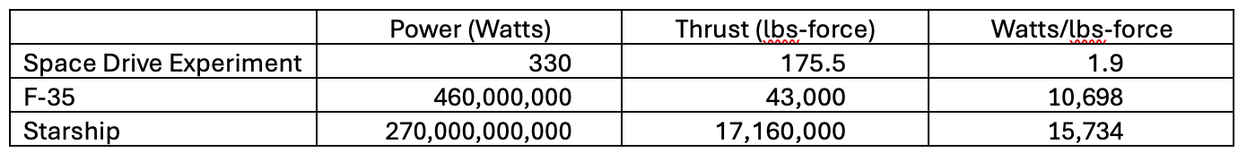 First, as stated above, it permits extremely efficient conversion of electricity into reactionless thrust. Let’s compare the best-case experimental result in the space drive paper with two well-known points of reference for generating thrust: the F-35 fighter jet with its single F135 turbofan engine and SpaceX’s Starship rocket, with its 33 Raptor rocket engines.